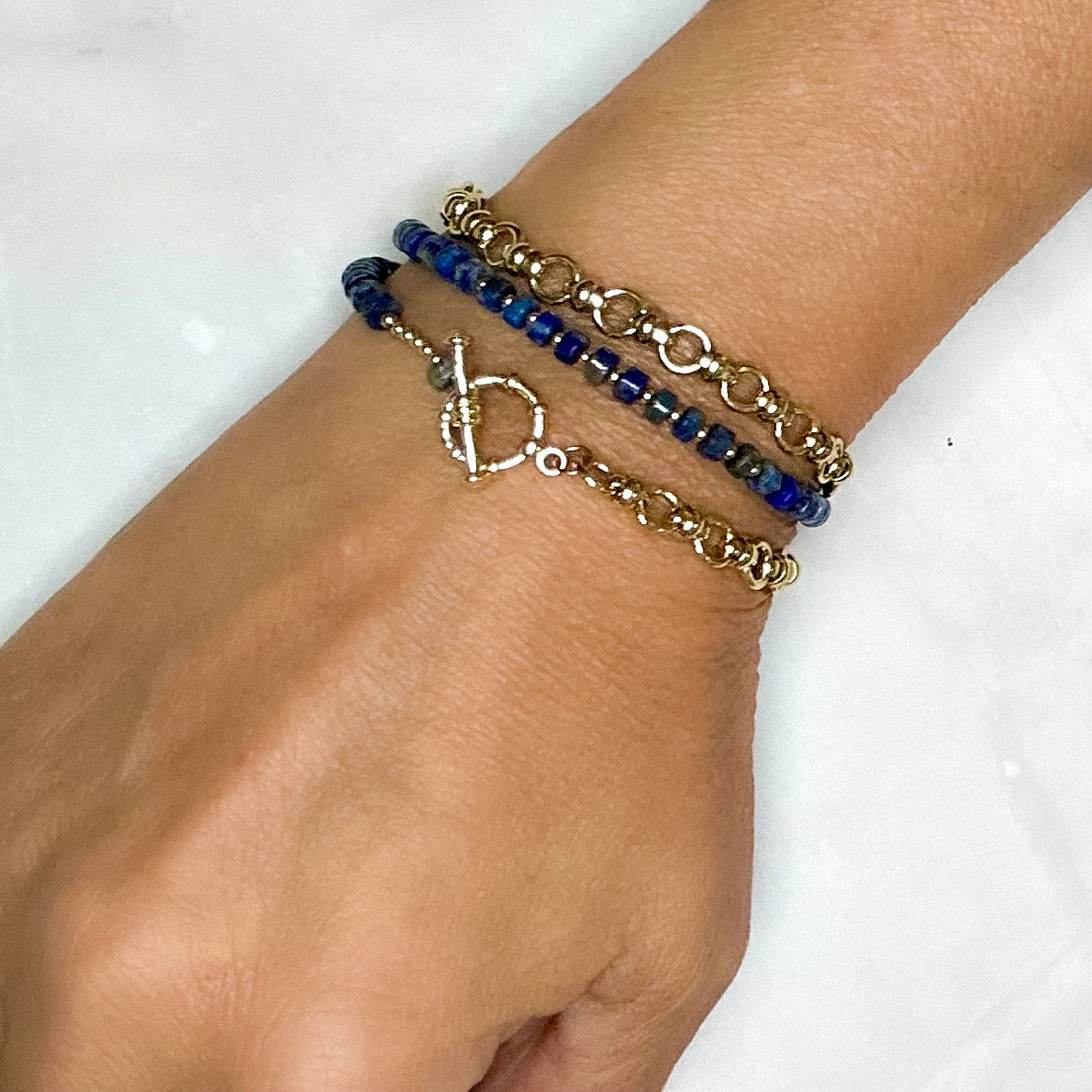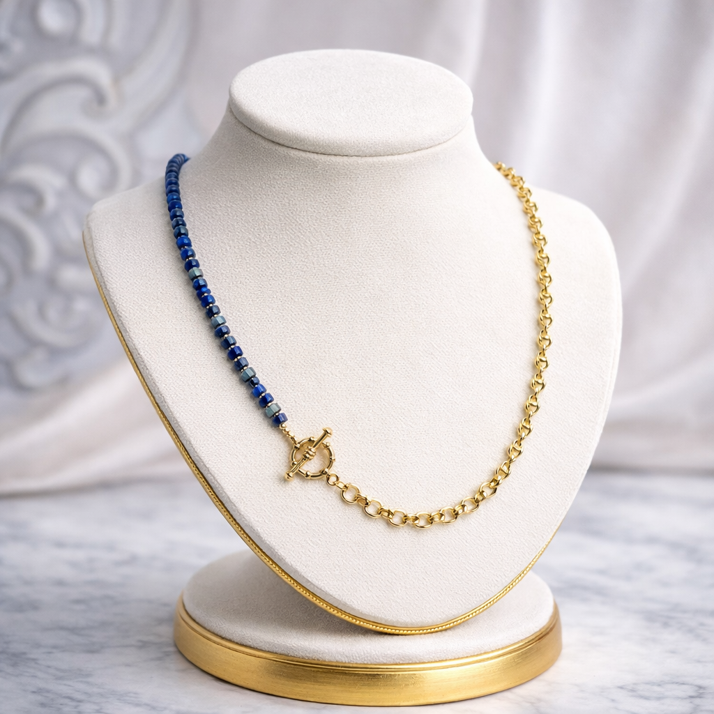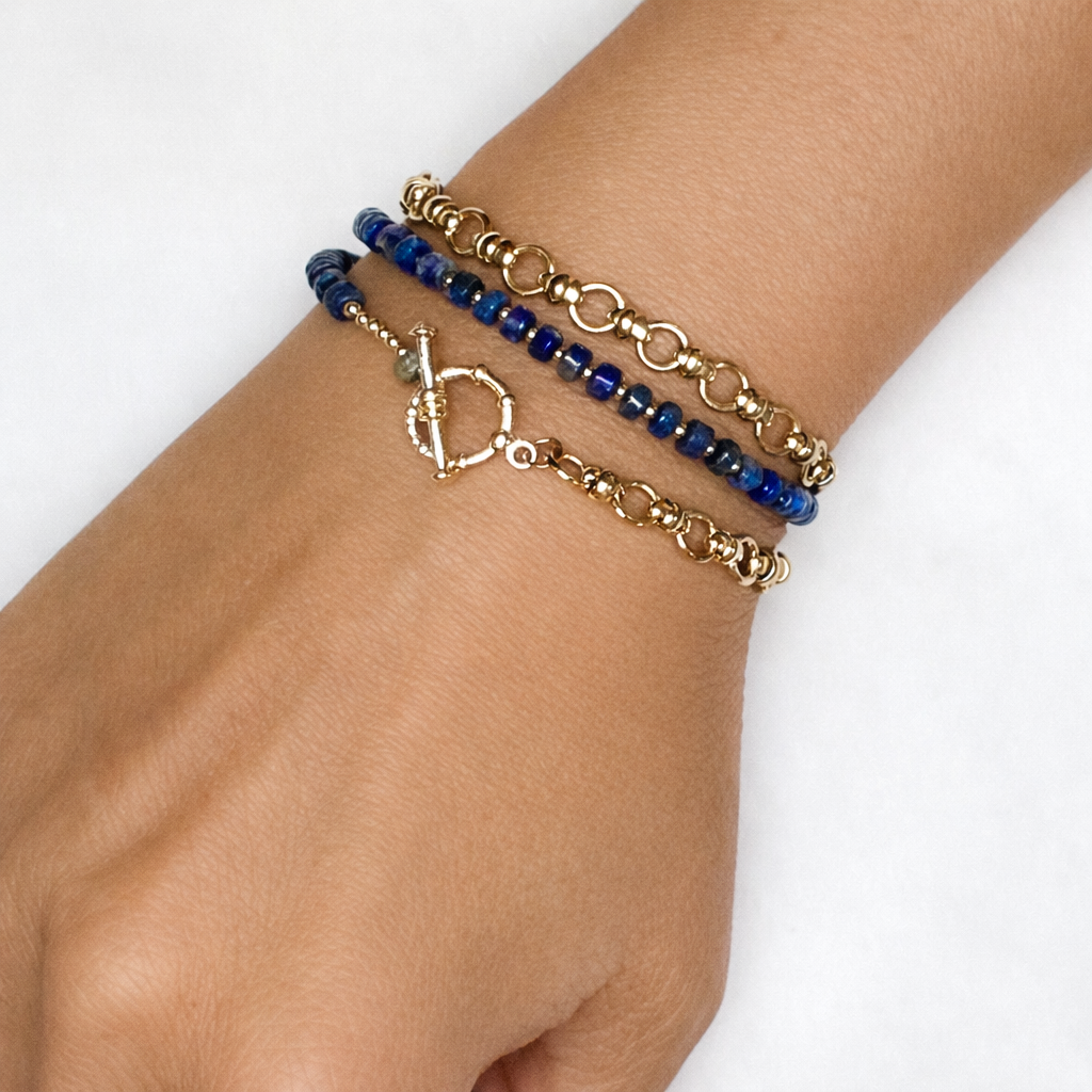 Bold and versatile, the Azura is designed to be worn two ways—as a statement necklace or wrapped three times around the wrist as a chic bracelet. Rich lapis lazuli beads pair beautifully with polished 14K gold beads, all accented by a 14K gold-plated chain for a modern, elevated look. Finished with a classic toggle closure, it balances elegance with effortless style.