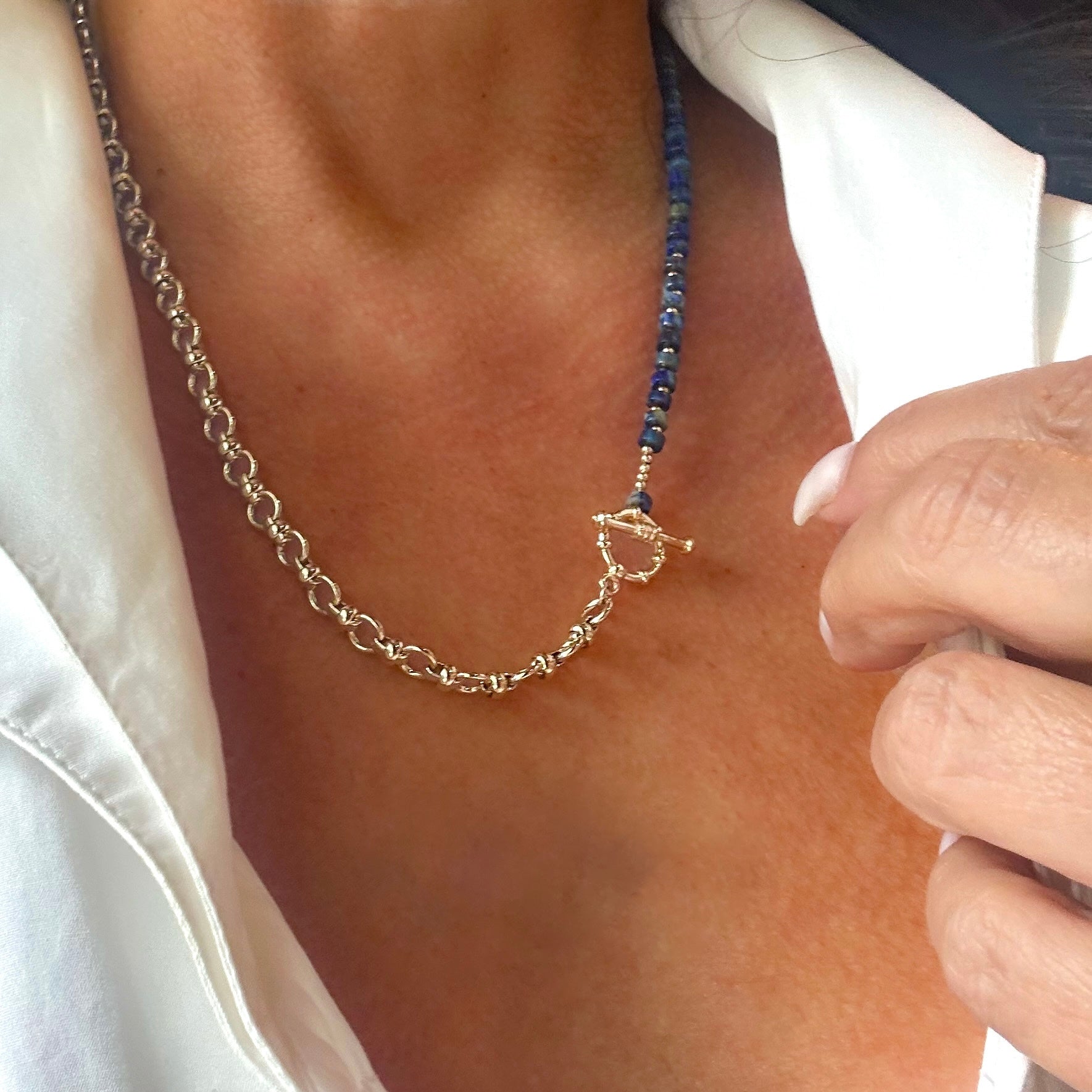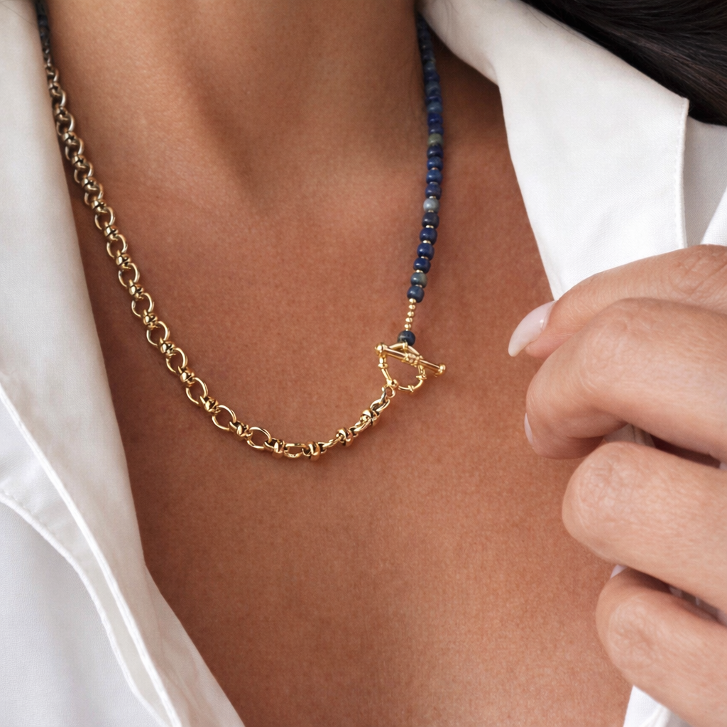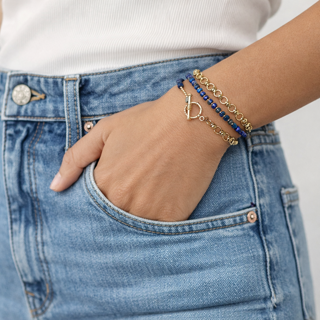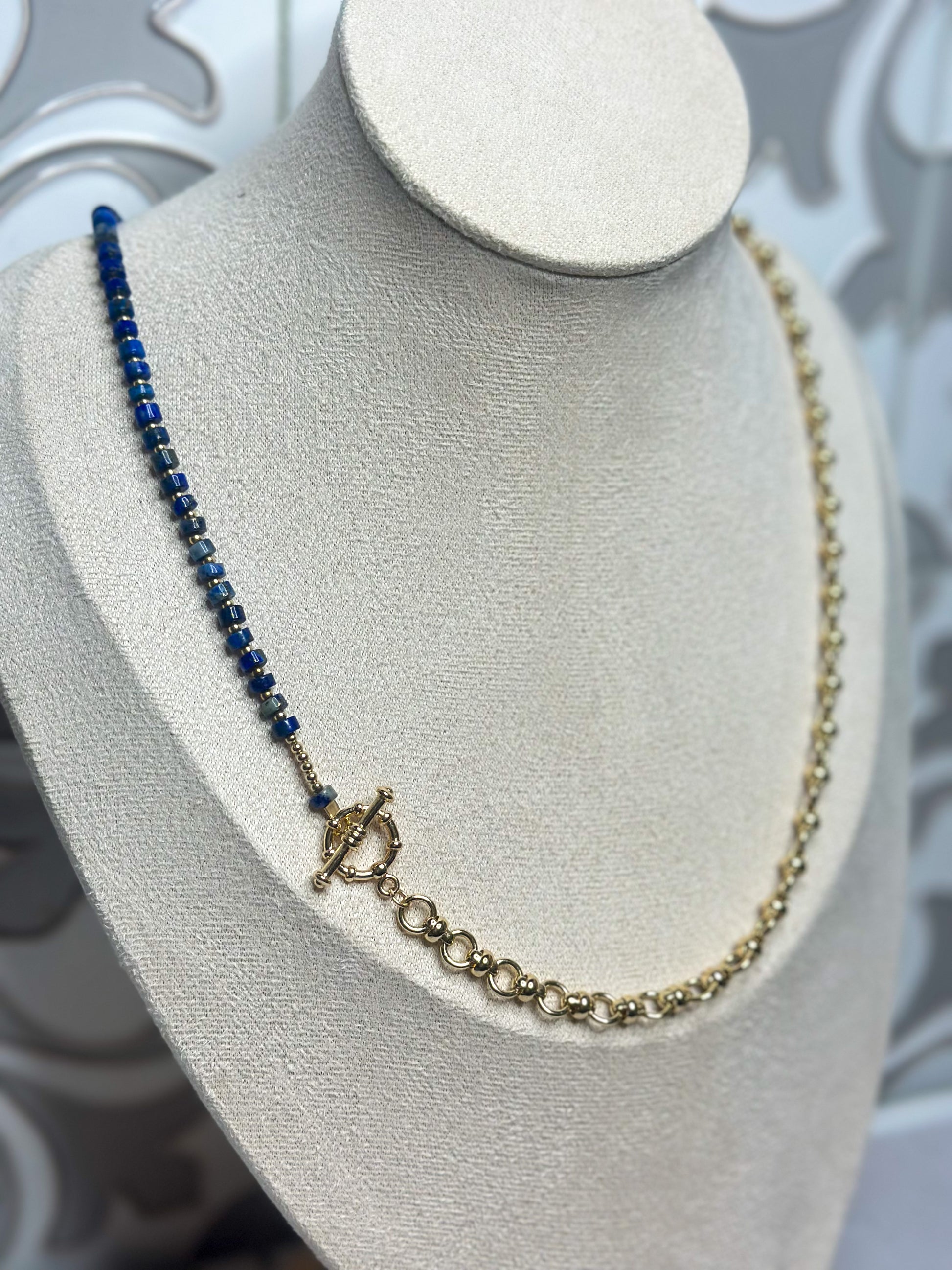 Bold and versatile, the Azura is designed to be worn two ways—as a statement necklace or wrapped three times around the wrist as a chic bracelet. Rich lapis lazuli beads pair beautifully with polished 14K gold beads, all accented by a 14K gold-plated chain for a modern, elevated look. Finished with a classic toggle closure, it balances elegance with effortless style.