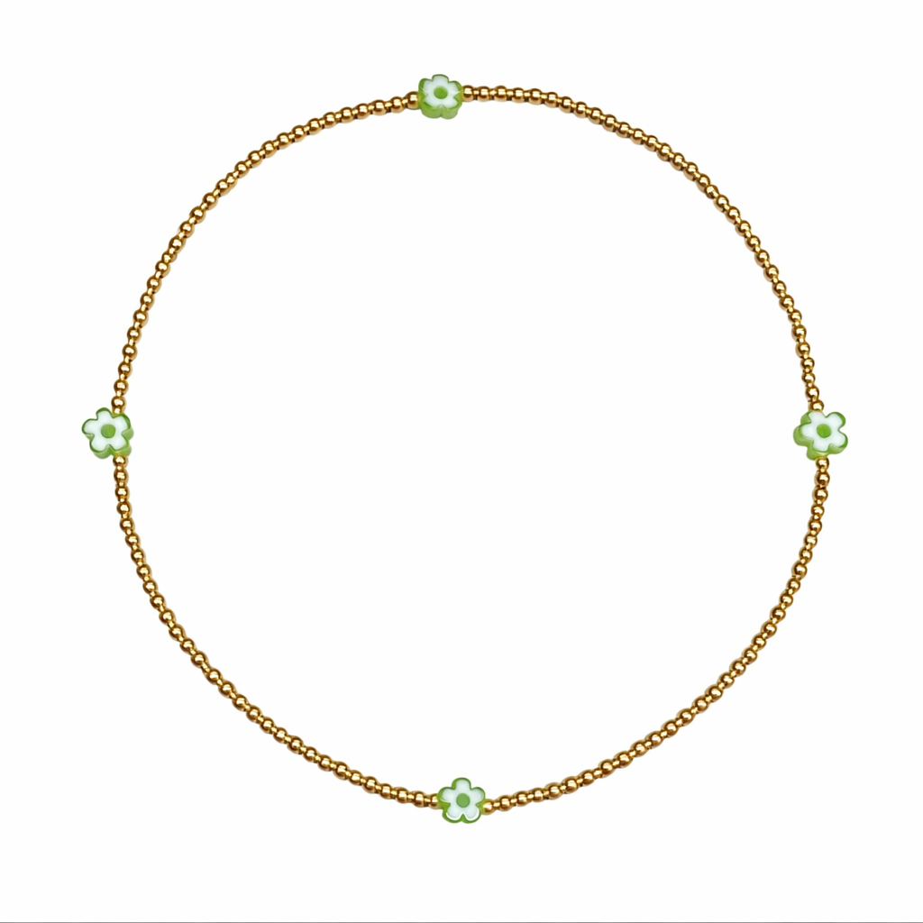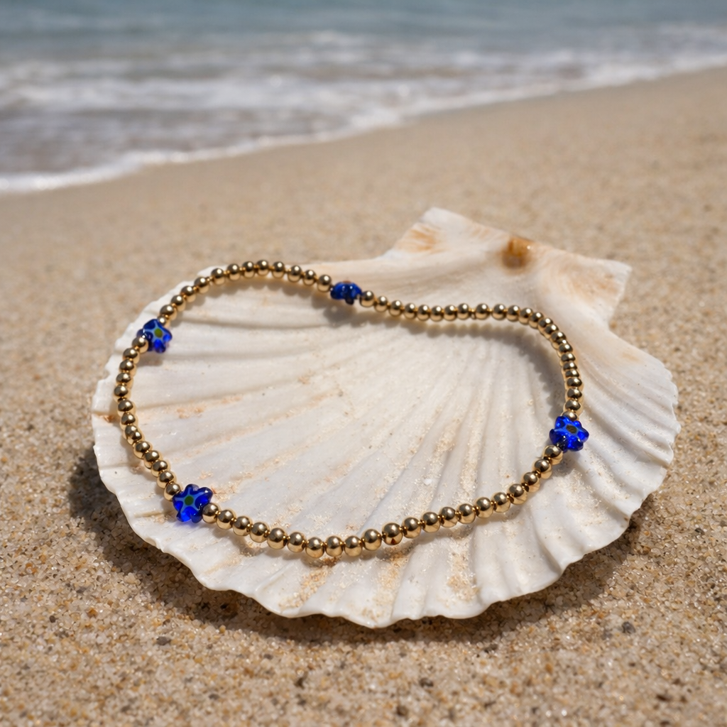 A sweet and sunny anklet designed to brighten your every step. Crafted with 3mm 14k gold beads and colorful glass flower accents, it brings a playful yet elevated touch to any look.