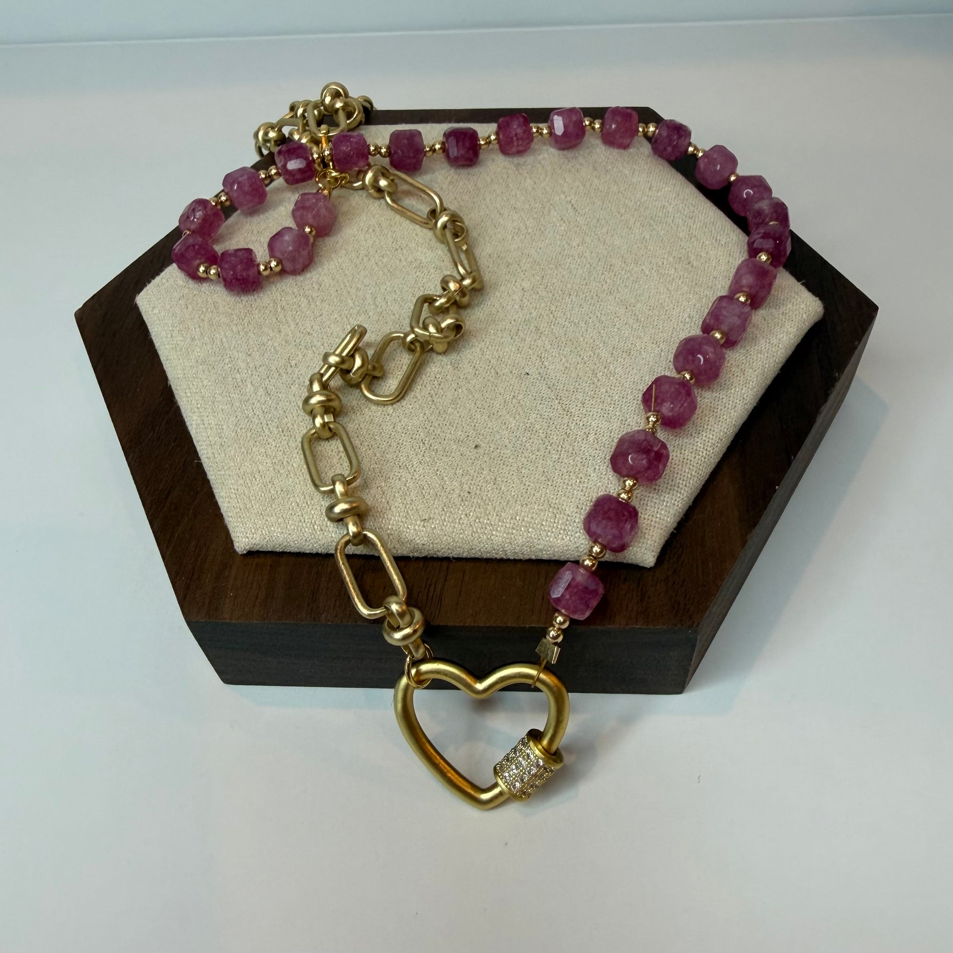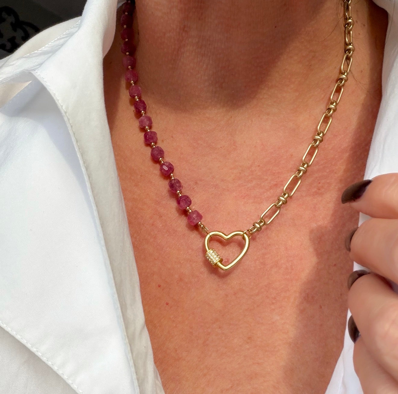 This necklace blends deep pink tourmaline, 14k accent beads with a matte gold paperclip chain for a mixed-texture look. Finished with a heart that opens and can be worn alone or use to personalize your piece by adding a charm.
