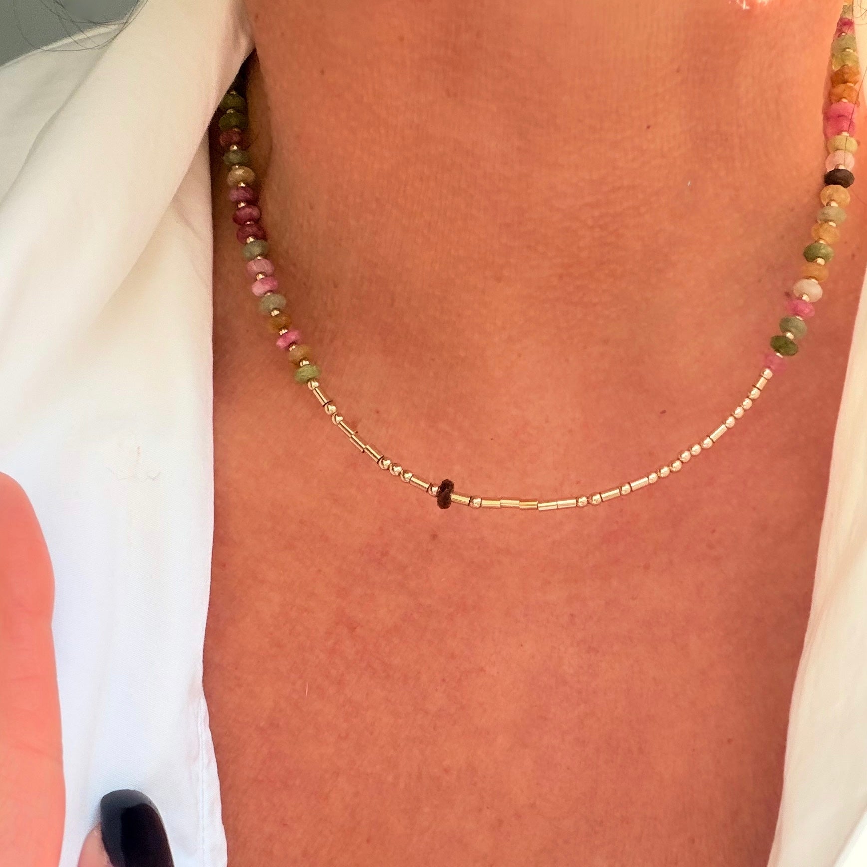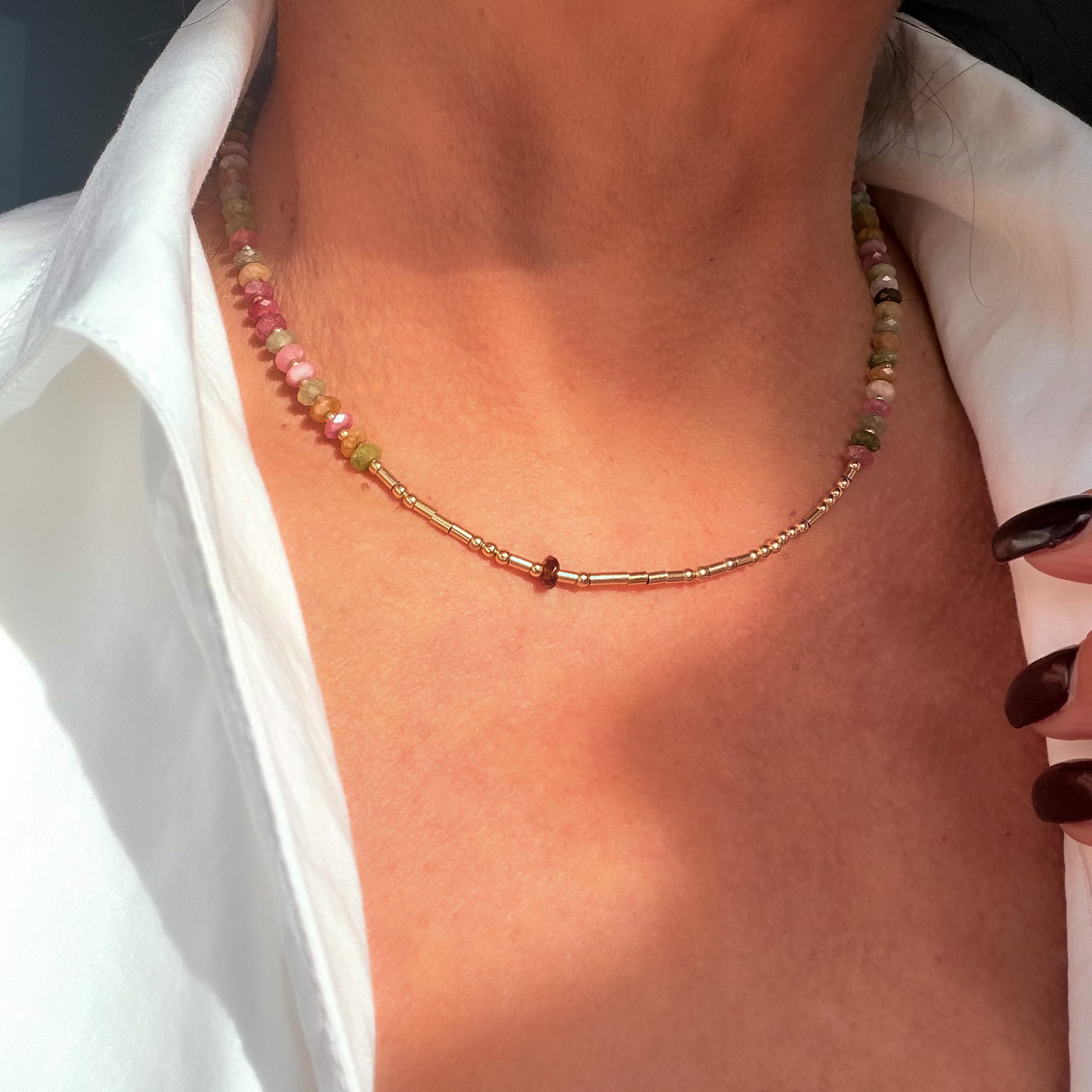 Watermelon tourmaline disc beads with 14k gold accent beads.