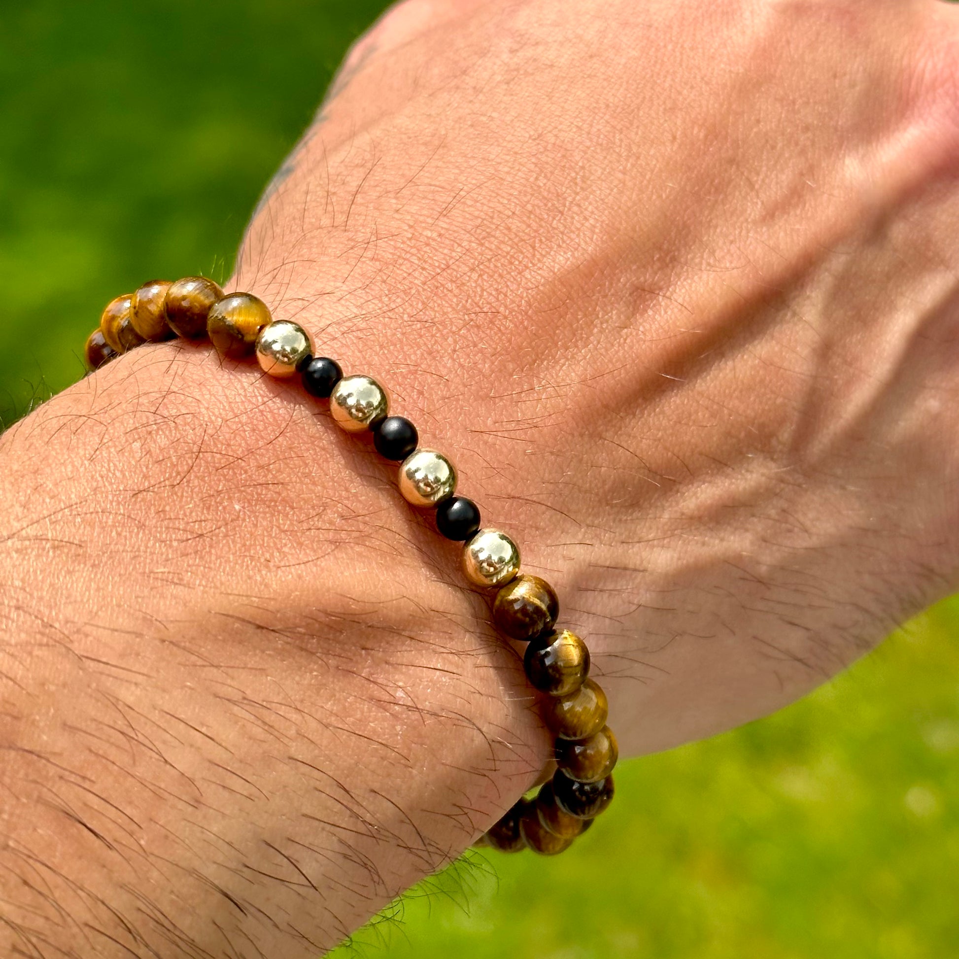 A bold men’s bracelet combining earthy 6mm Tiger Eye beads with sleek 6mm 14k gold accents and subtle 4mm Onyx beads for a strong, grounded look.